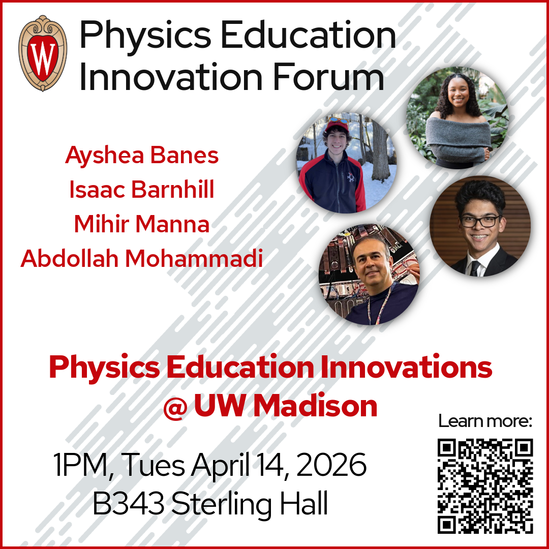 - Abstract: This month we have updates on projects in physics education that are being led by people in the Department of Physics. These studies have the potential to improve physics and other courses at UW and elsewhere. Please join us in learning about them and providing helpful comments. Ayshea Banes: My research explores ways to center Blackness within the physics classroom and how this may transform the Eurocentric pedagogy currently used to one that is culturally relevant and community-based. Another topic I researched (with Erika Marin-Spiotta, Dept. of Geography) was ways that anti-Blackness (more commonly known as white supremacy) appear within physics education and how by identifying its exclusionary mechanisms/assimilationist norms may lead to roads of Black liberation. Isaac Barnhill (with Josh Weber & Peter Timbie): This experiment makes a controlled comparison between two different styles of instructional physics lab activity: traditional labs which aim to reinforce content learned in the course lectures, and experimentation labs which aim to teach students the role of experimentation in science broadly, and physics in particular. The study uses data from Physics 202 students to explore how students’ personal views on the nature and utility of experimentation are impacted by their lab curriculum and whether the new curriculum affects student exam scores. Mihir Manna (with Ben Spike): Our research is centered on supporting strategic problem-solving approaches by students in Physics 103. Specifically, we are writing new discussion problems that encourage students to choose their own high-level strategies, rather than following a traditional “fill in the blanks” structure that can limit student agency. We hope that these prompts will help students gain a better appreciation for the usefulness of physics principles, generalize such approaches to other contexts, and feel more self-confident in their problem-solving ability. Abdollah Mohammadi: will present the results of a recent survey on the use of artificial intelligence (AI) tools in our physics service courses, mainly 103, 104, 201, 202, 207, and 208. The survey explores how students engage with AI for learning, problem-solving, and testing their understanding, as well as their perceptions of its benefits and limitations. Key findings highlight trends in AI adoption, including its role in enhancing conceptual understanding, improving efficiency in coursework, and raising concerns about academic integrity. The results also reveal variations across different course levels and backgrounds. These findings could be useful to discuss and come up with some best practices for incorporating AI in a way that supports learning while maintaining rigorous academic standards.